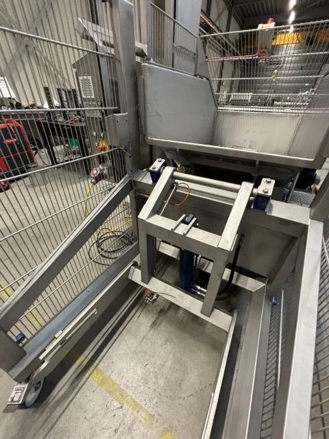 De hydraulische normwagen kantelaar positioneert en kiept de met deeg gevulde normwagens gecontroleerd in de stortbunker.